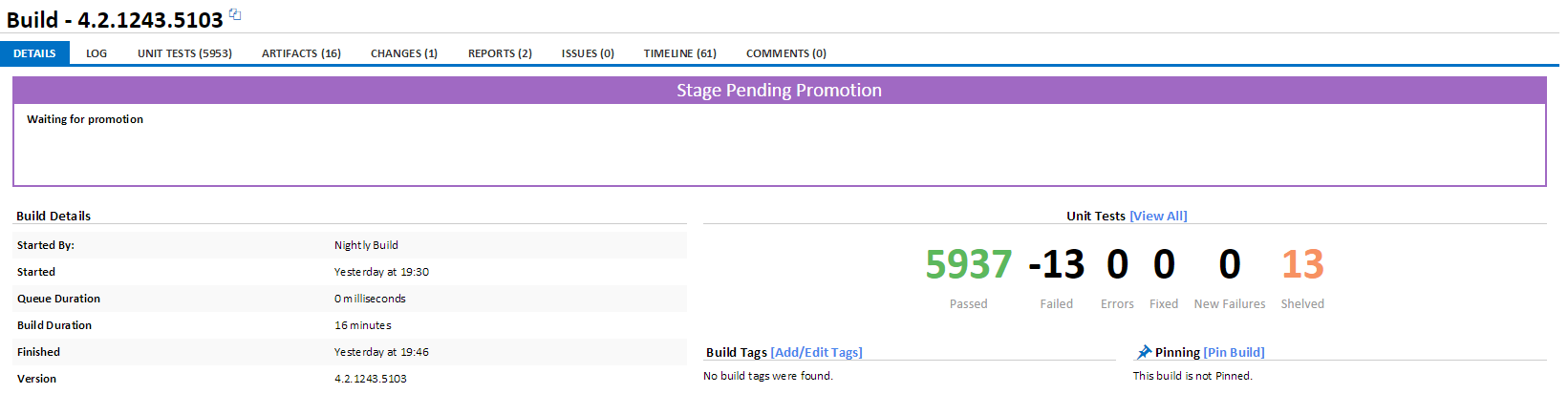 hovering over the build item (colored version number) it shows “-13” unit tests in red.